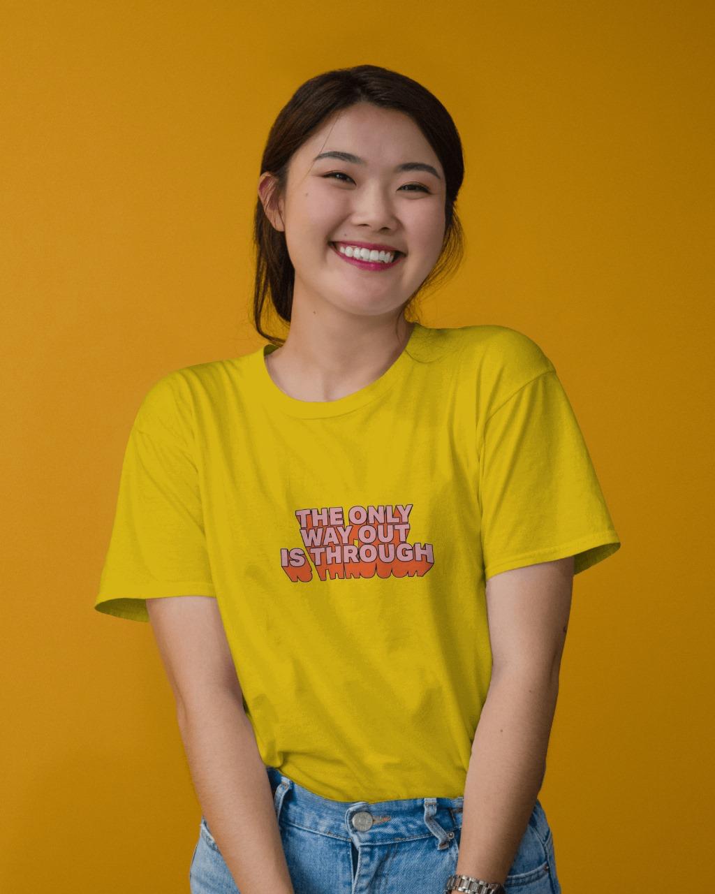 Boldly proclaim "THE ONLY WAY OUT IS THROUGH" with this empowering women tee.